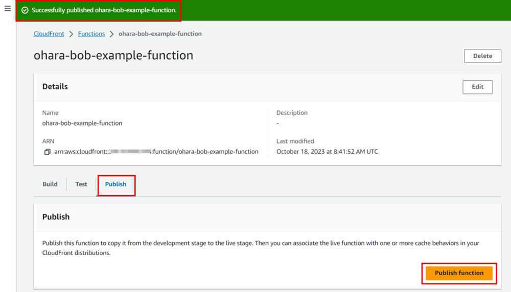 CloudFront関数の更新が完了したら、CloudFront関数をPublishします。