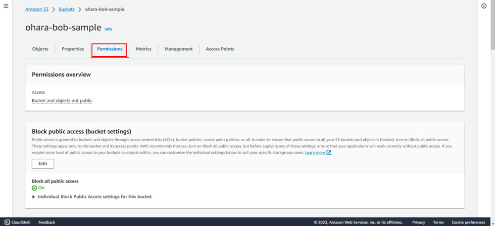 S3 bucket の`Permissions`管理タブにアクセスします。