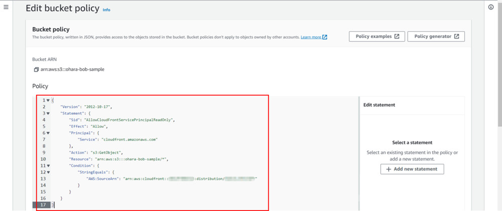 以下の情報を許可ポリシーエディットボックスに追加して、CloudFrontインスタンス用のS3 bucket の読み取り専用パーミッションを設定します。 bucket 名とCloudFront ARN情報を置き換える必要があります。
