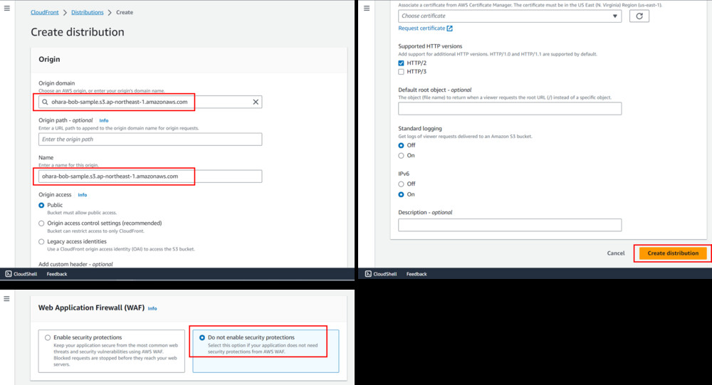 Amazon CloudFrontコンソールで新しいDistributionインスタンスを作成します。`Origin Domain`の設定項目で、作成したS3 bucket をドロップダウンボックスから選択します。今回はクイックな構築なので WAFサービス は有効にしないようにします。もし商用サービスとして構築するのであれば、セキュリティを向上させるためにWAFサービスを有効化する必要があります。