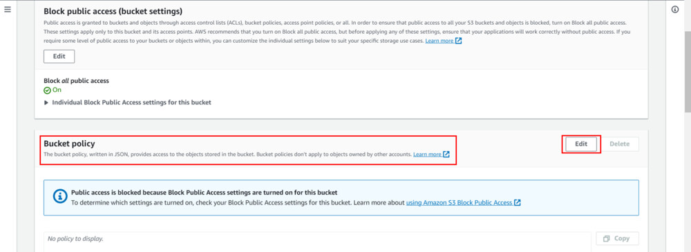 `Bucket policy`セクションまでスクロールダウンし、編集します。