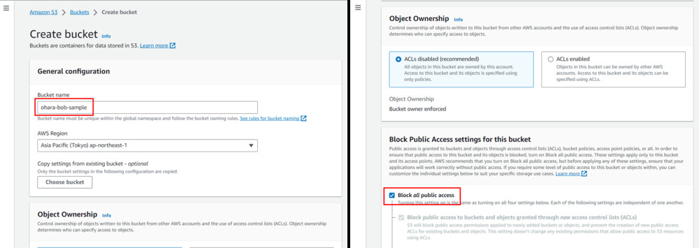 コンテンツ配信にAmazon CloudFrontを使用する場合、ユーザはCloudFrontを通して bucket のコンテンツにアクセスします。このため、以降のステップでは、パブリックアクセスを無効にし、 bucket コンテンツへのCloudFrontアクセスのみを設定します。