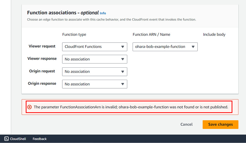 コンソールでCloudFront Viewer Request関数を設定する際、該当する関数が見つからないというエラーメッセージが表示される場合は、関数管理ページで該当する関数が正しく公開されているかを確認する必要があります。