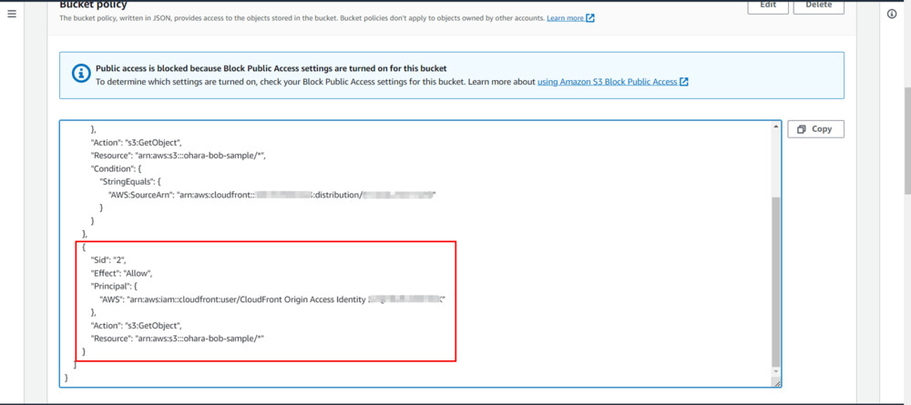 OAC設定が完了したら、対応するS3 bucket の許可ポリシー管理ページで、新しく更新された許可ポリシー情報を見ることができます。