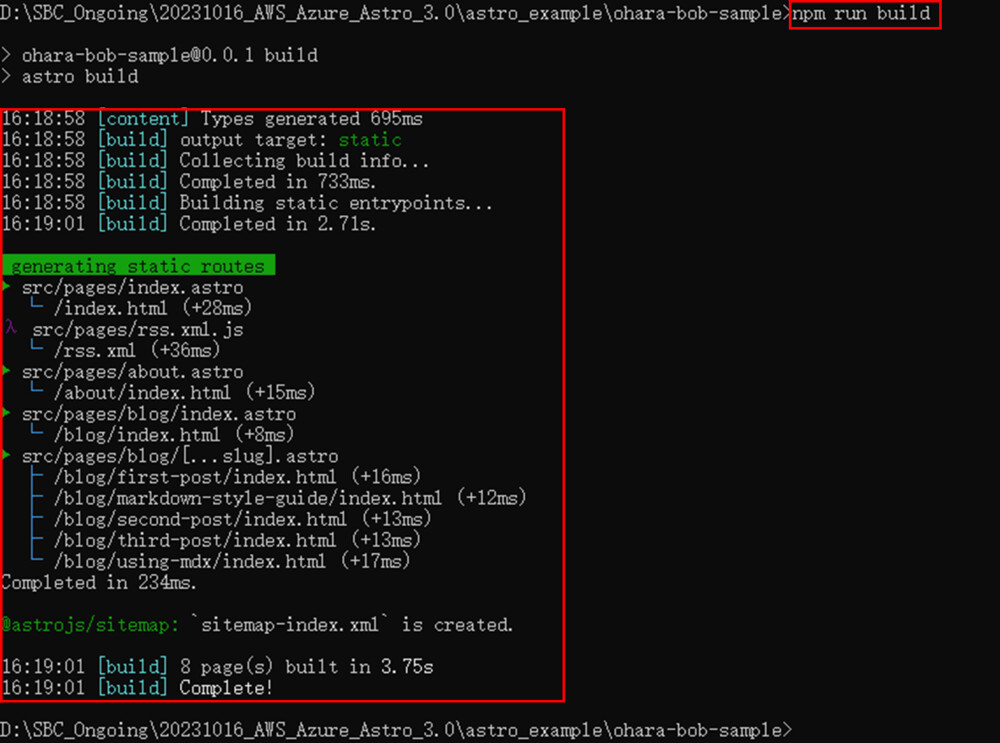 開発モードとして起動が成功したら、今度は `npm run build` コマンドを使って、アプリケーションをデプロイします。