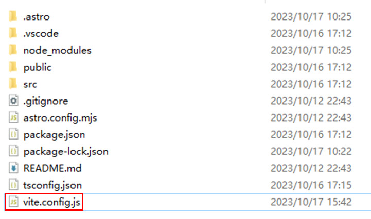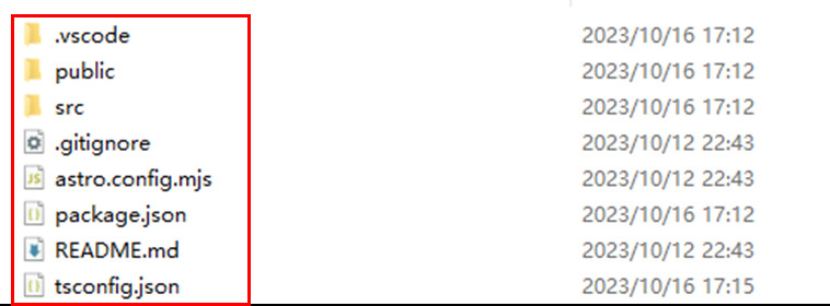 Astroはインストールに成功すると、プロジェクトパスの配下に関連ファイルを生成します。