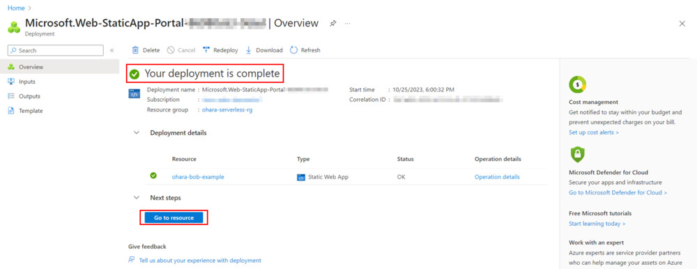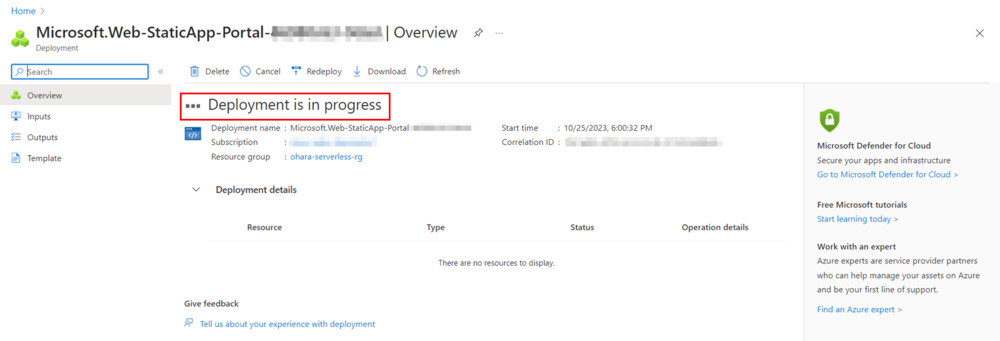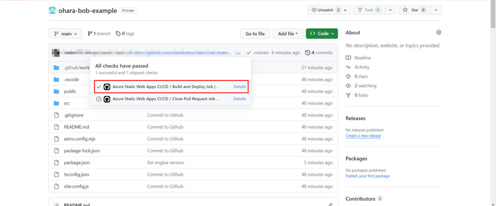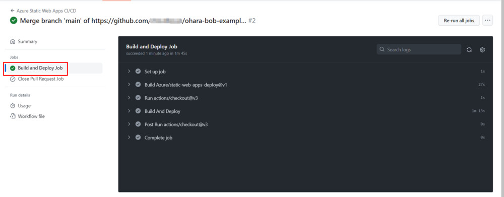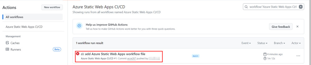 作成に成功すると、Azure Static Web Apps プロジェクトは自動的に Git Workflow をトリガーしてコードの build とデプロイを行います。