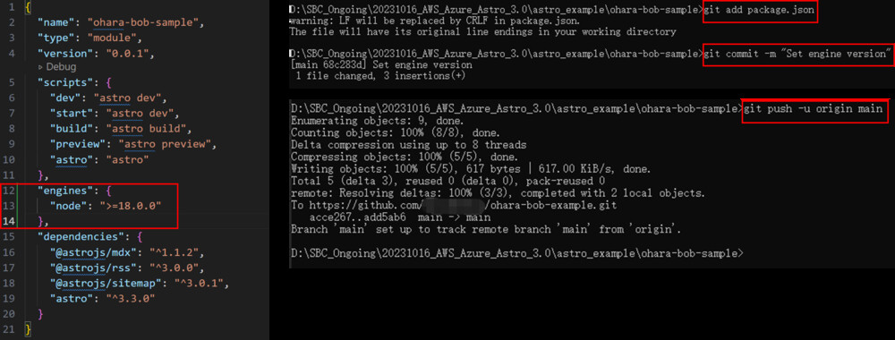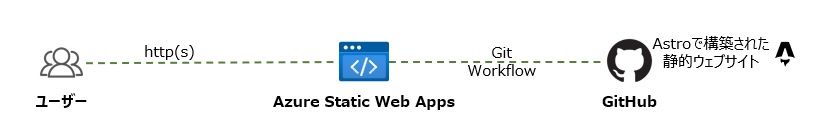 構築の流れとして、Astroでbuildし生成した静的WebサイトをAzure Static Web Appsへデプロイしながら静的コンテンツ配信をします。またAzure Static Web Appsからgithubへ連携させることで、サービス開発のCI/CDプロセスを簡単かつ迅速に行うことができます。なおAstro 3.xにはNodejsのバージョンが必要なので、v18.14.1以上を使用する必要があります。