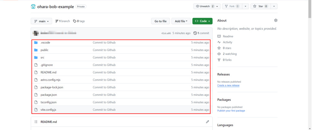 Azure Static Web AppsはGitHubと統合されており、Git Workflowを使用したビルドとデプロイが簡単になります。このサービスは、プロジェクトのコードリポジトリへのアクセス権を得ることで動作します。リポジトリ内で特定のブランチが更新されると、プロジェクトのビルドとデプロイが自動的に開始され、ウェブサイトが更新されます。 まず、Astroで開発したウェブプロジェクト用に新しいコードリポジトリを作成します。その後の設定ステップで、Azure Static Web Appsがそのリポジトリへのアクセスを許可します。リポジトリはプライベート設定が可能です。