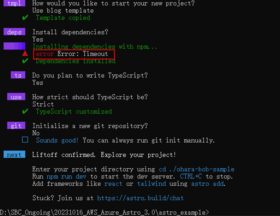 Astroインストールウィザードを使用してAstroプロジェクトをインストールおよび設定する際、インストール依存パッケージのステップでタイムアウトエラーが発生した場合、その後のステップでnpm runコマンドを使用すると、高い確率で「astro not recognized」エラーメッセージが表示されます。