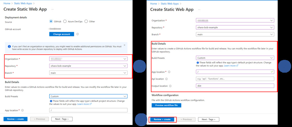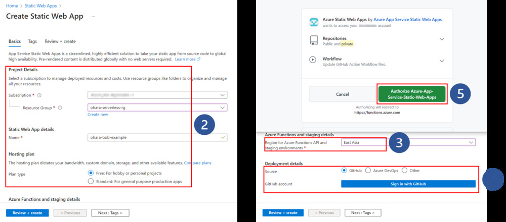 Azure Static Web Appsでは、無料のホスティングプランを含む2種類のホスティングプランを提供しています。今回サンプルプロジェクトとして無料のホスティングプランを選択します。次に「Deployment Details」でGitHubを選び、「Sign in with GitHub」ボタンをクリックして、表示されるポップアップウィンドウからGitHubアカウントにログインします。これにより、Azure Static Web Appsがプロジェクトのコードとワークフローにアクセスすることが可能になります。