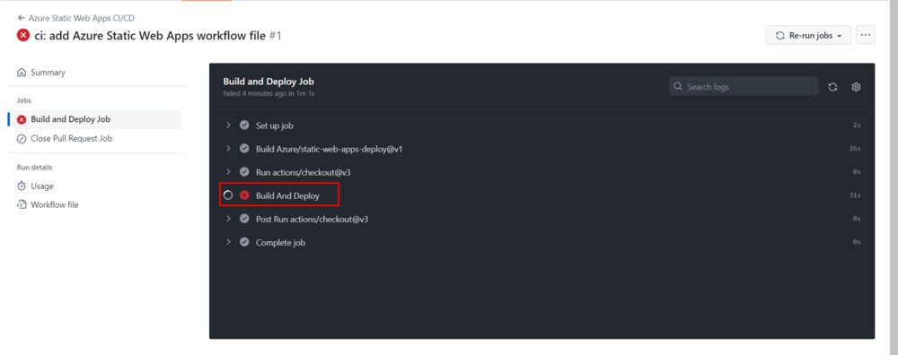 Azure Static Web Apps の管理ページに表示されるアプリケーションのステータスが長期間「Waiting for deployment」になっている場合、Git Workflow の実行に失敗したことが原因である可能性が高いです。