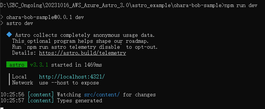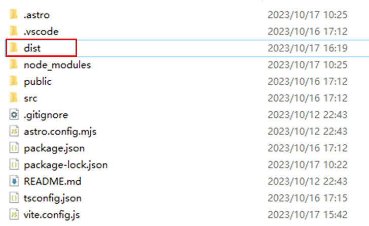 コマンドが成功すると、プロジェクトのルートディレクトリに `dist` フォルダーが生成されます。フォルダ内のファイルは、以降デプロイメント手順にて使用されます。これでローカル環境にてAstroが無事デプロイできたと思います。次のステップとして、ローカル環境にデプロイしたAstroや関連フォルダをAzure側へ反映する作業になります。