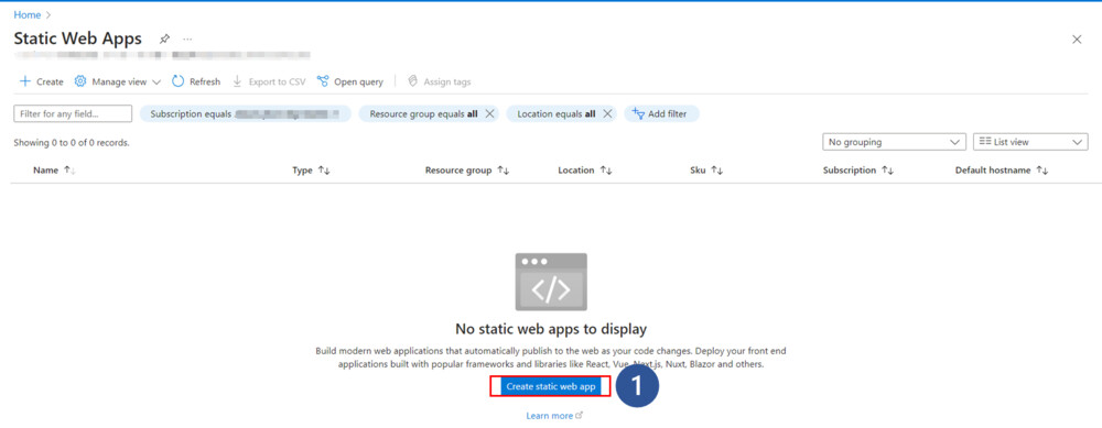 Azure Static Web Apps コンソールで新しいプロジェクトを作成します。