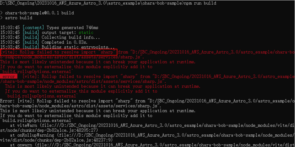 ブログプロジェクトテンプレートに基づいて作成されたAstroプロジェクトを build すると、`[vite]: Rollup failed to resolve import "sharp" from ...`というエラーメッセージが表示されます。