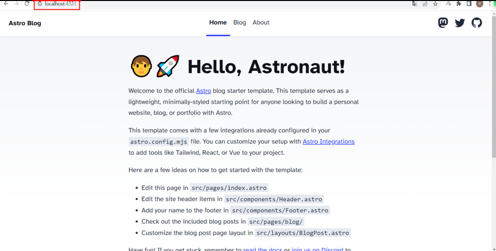 生成されたプロジェクトのルートディレクトリに入ったら、`npm run dev`コマンドを使ってアプリケーションを開発モードで起動します。ローカルからブラウザでプロジェクトページを見るには、http://localhost:4321/ にアクセスします。