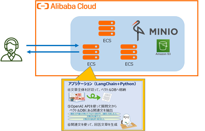 Alibaba Cloud上でMinIOを立ち上げる方法は色々ありますが、今回はシンプルにECSこと仮想コンピューティング3台で立ち上げます。MinIOはHA構成として構築もできるので、ECS1台でも100台でも問題ないです。もちろんAlibabaCloudのFunctionComputeやContainer Service for Kubernetes (ACK)でMinIOを立ち上げることもできます。ECSでMinIOによるオブジェクトストレージを立ち上げたあと、その1つのECSにLangChain+Pythonによるアプリケーションを配置し、実行するだけです。今回はテックブログ用にクイックなDemoなので、かなり簡略化した手順となりますがご了承ください。