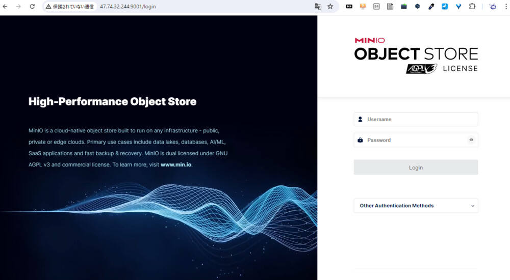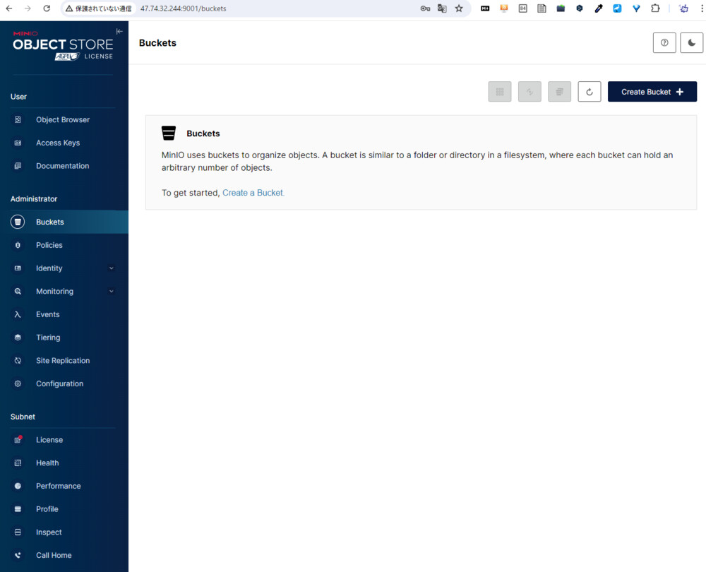 これで、ブラウザからMinIOコンソールにアクセスで操作できるようになります。