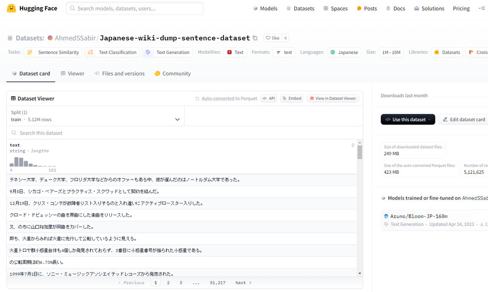 dataset = load_dataset("AhmedSSabir/Japanese-wiki-dump-sentence-dataset")