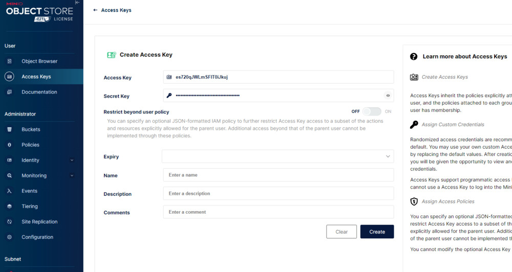 MinIO からAccess Keyを発行し、セキュリティ対策を図ることもできます。