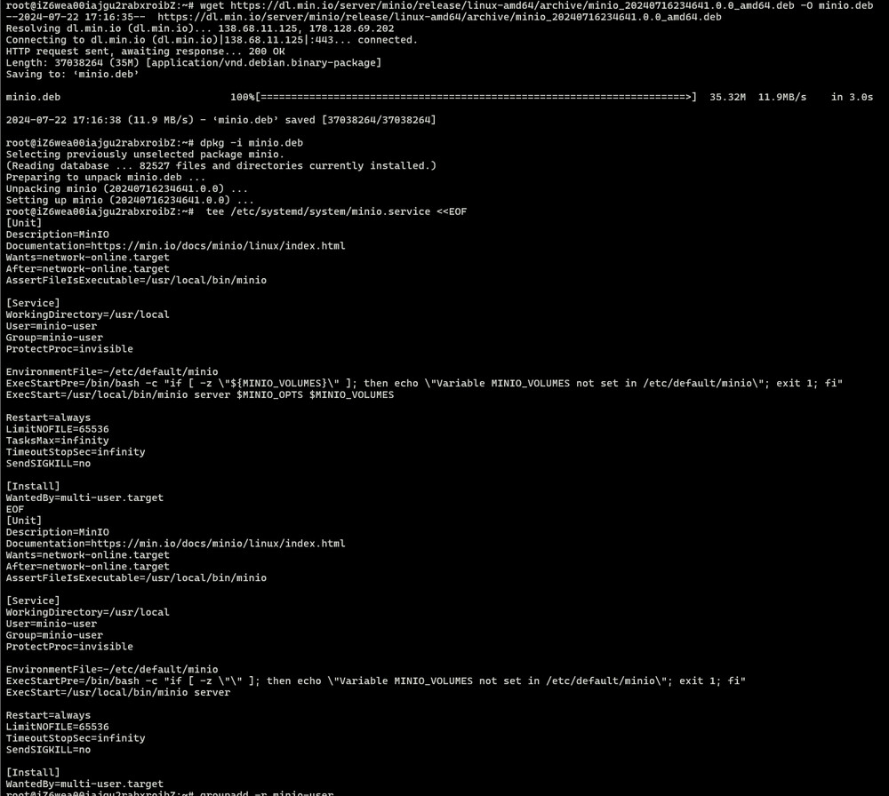 wget https://dl.min.io/server/minio/release/linux-amd64/archive/minio_20240716234641.0.0_amd64.deb -O minio.deb