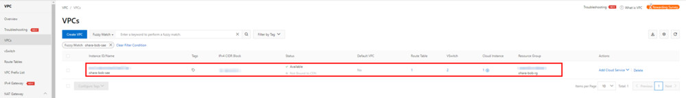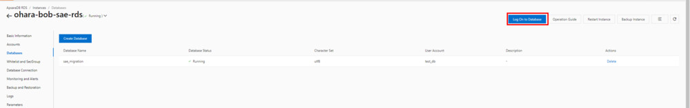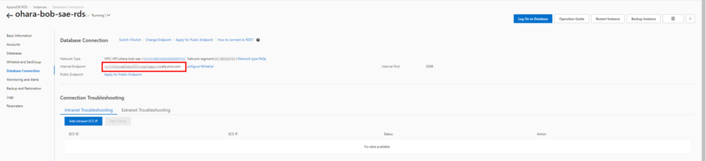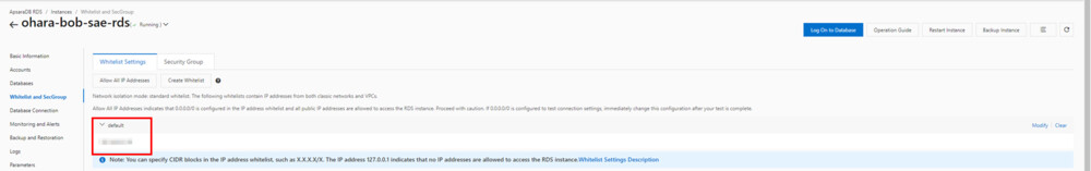 コンソールでホワイトリストの設定を確認します。作成プロセスで「Add to Whitelist」を「Yes」に設定すると、VPCのCIDRブロックがページに表示されます。この設定がないと、ECSまたはSAEインスタンスに展開されたアプリケーションからの接続は、セキュリティ上の理由で拒否されます。