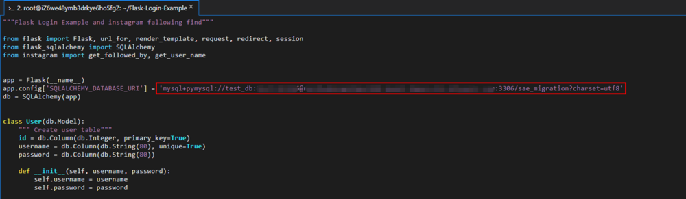 viコマンドを実行し、app.pyのデータベース設定をSQLiteからMySQLに更新します。