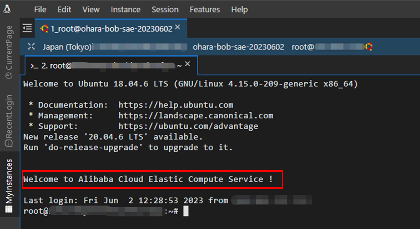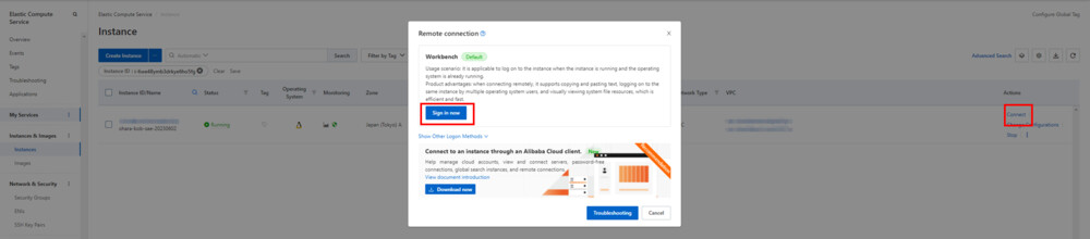 コンソールの「Connect」リンクをクリックし、作成したECSインスタンスに接続します。ウィザードに従って、ユーザー名や秘密鍵などの必要な情報を入力します。