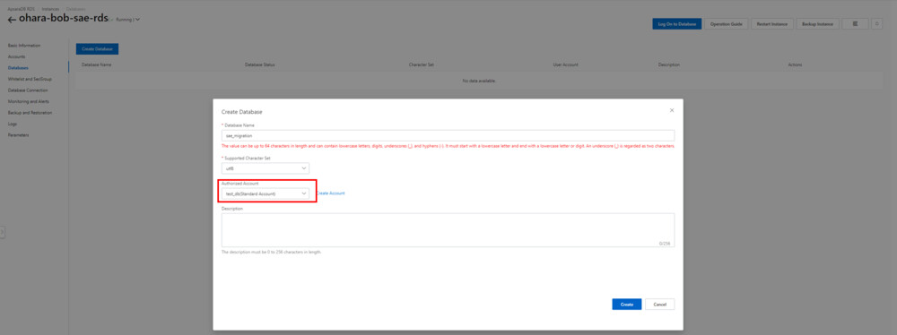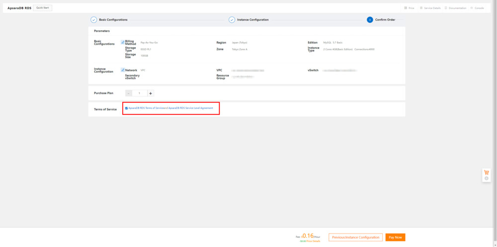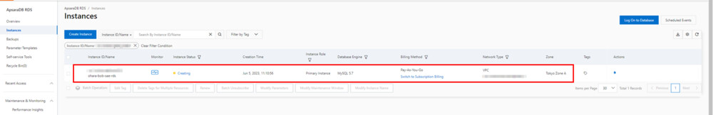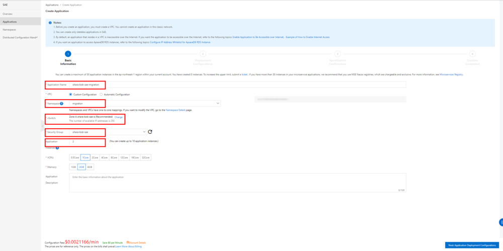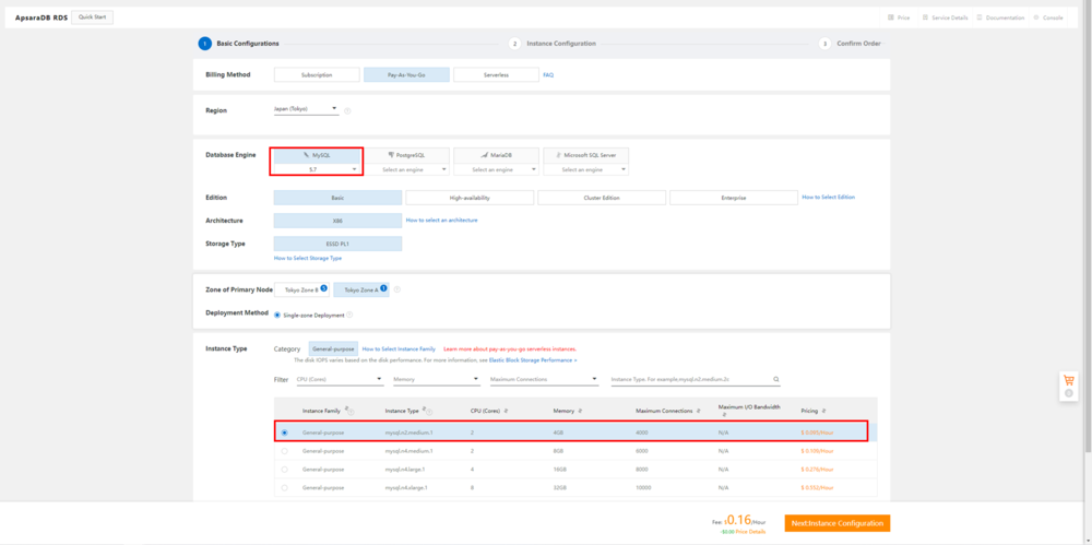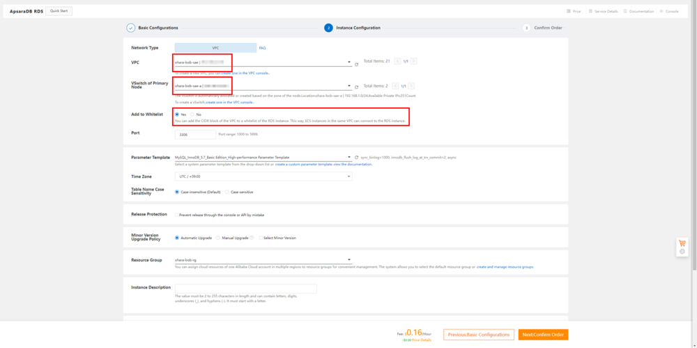 アプリケーションの構造から、データはRDSのMySQLインスタンスに保存されます。ターゲットRDSインスタンスが同じVPCとvSwitchの下にあることを確認し、将来的に内部接続を使用できるようにします。