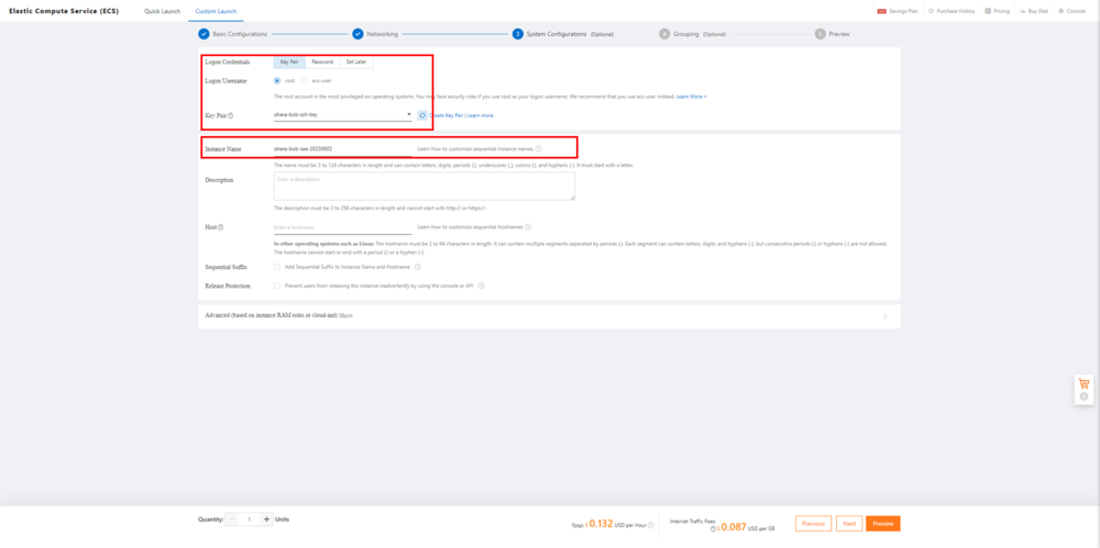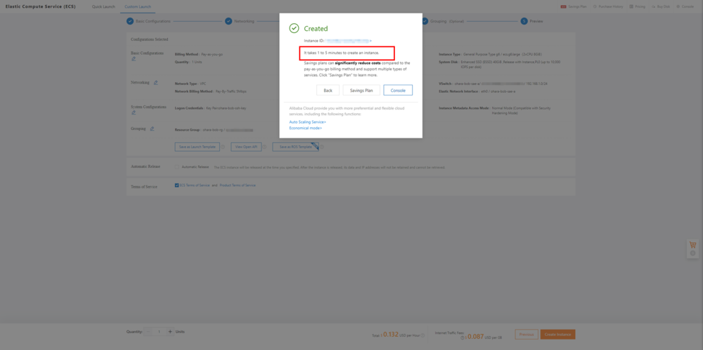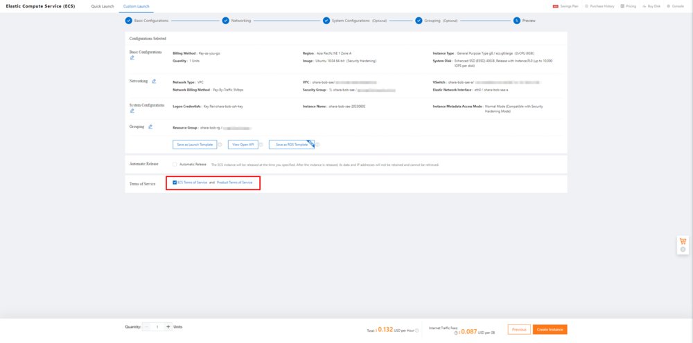 すべての設定を確認し、対象のECSインスタンスを作成します。
