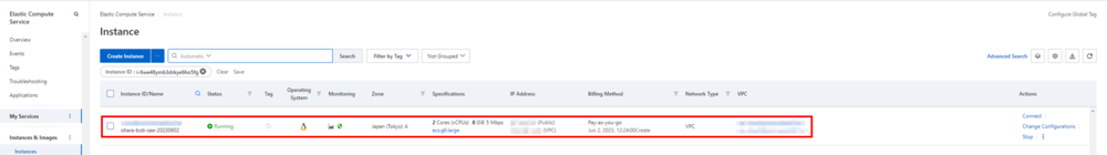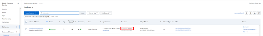 インスタンスにパブリックIPアドレスを設定し、WebブラウザからWebアプリケーションにアクセスして実行状況を確認できるようにしています。作業環境に応じて、EIPやSLBを代わりに使用することも可能です。