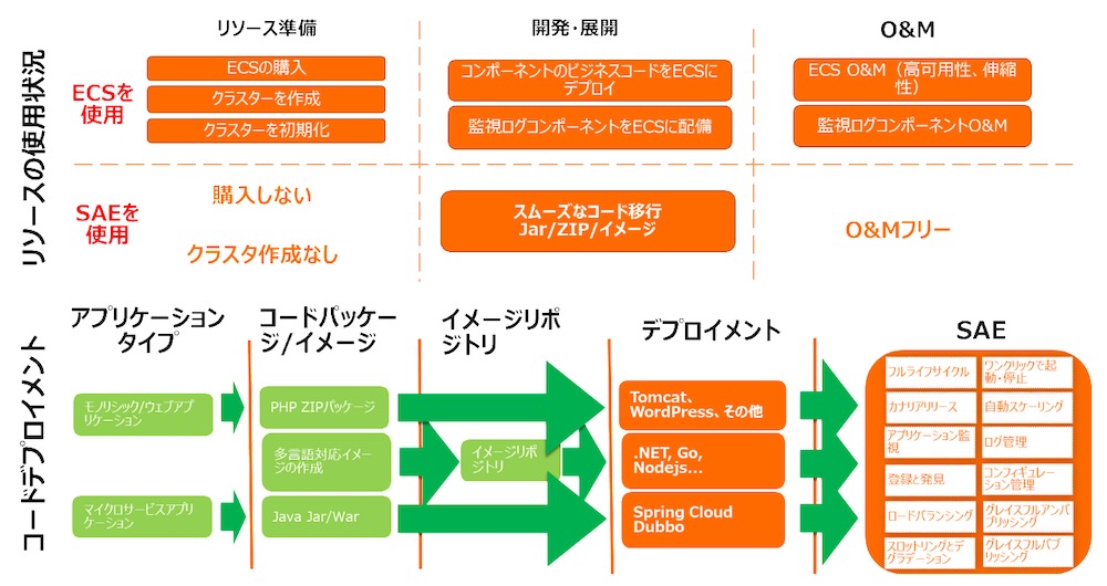 前回の記事通り、Alibaba Cloud SAE ( Serverless App Engine ) はユーザーがアプリケーション・サービスのコードを用意するだけで、あとはSAEが全部管理・運用してくれるサービスです。そのため、同じIaaS・仮想コンピューティングのAlibaba Cloud ECS(Elastic Compute Service)を使ったアプリケーション・サービス構築と比べると、SAEのサーバーレスアーキテクチャーおよび機能によりユーザー観点での構築負荷や運用工数を大幅に軽減してくれます。