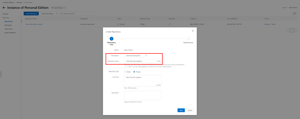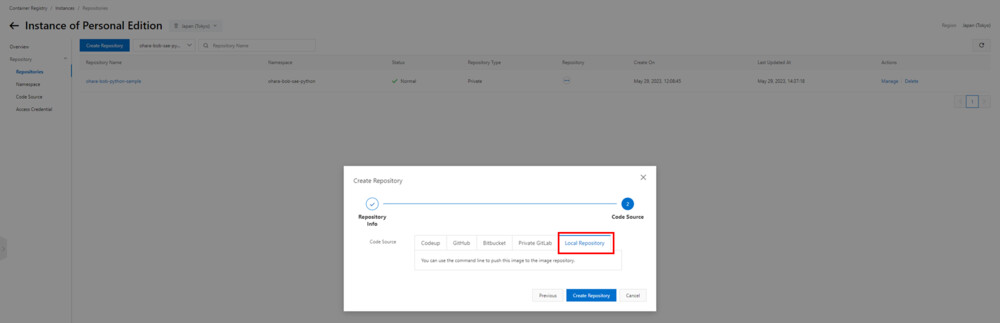カスタマイズしたイメージをACRにコミットするために、まずリポジトリを作成する必要があります。製品サービスを有効化し、特定のネームスペースがすでに1つあることを確認してください。
