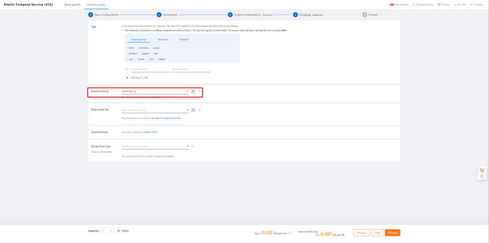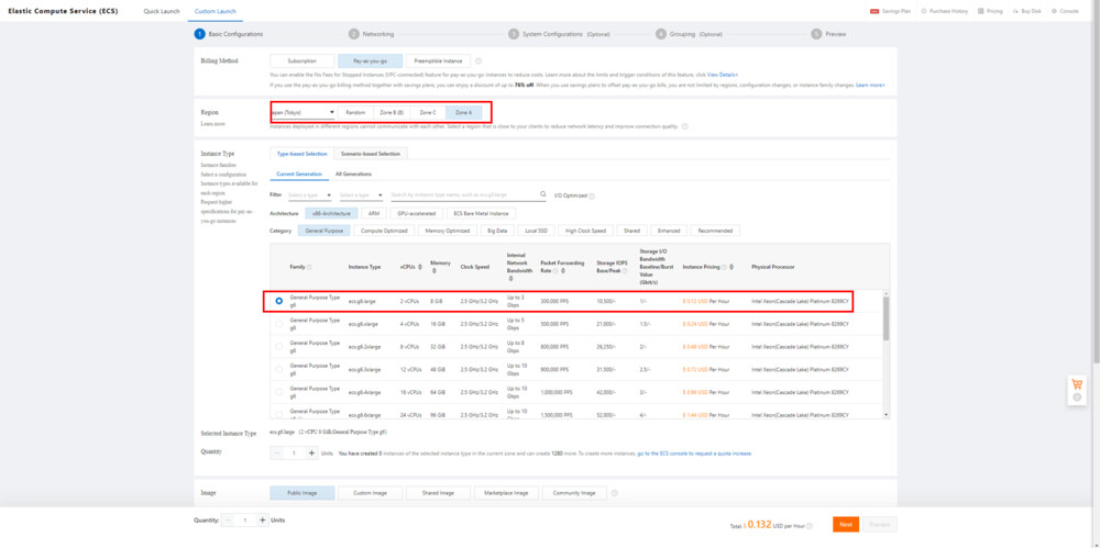 今回は、インスタンスタイプを「ecs.g6.large」、イメージを「Ubuntu 18.04 64bit」とします。要件に応じて構成を変更することも可能です。