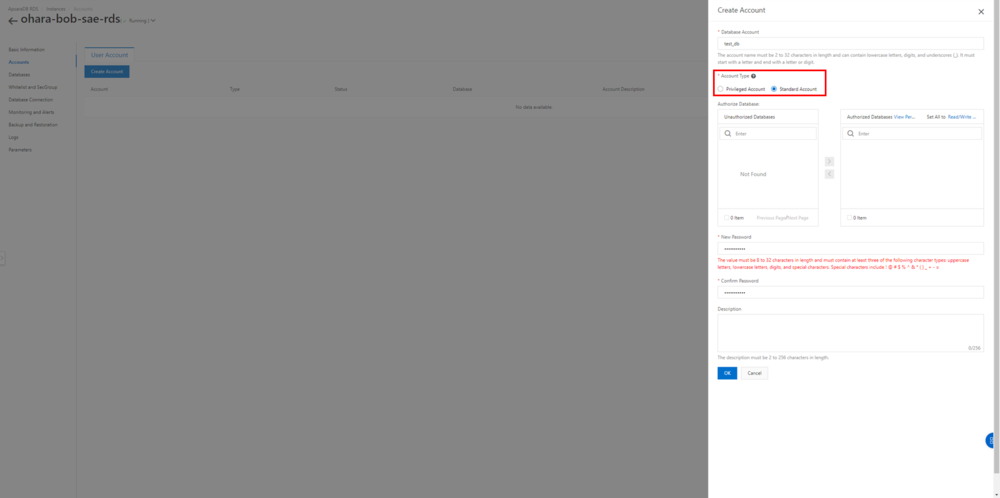 データベースを作成し、Authorized Accountを上記で作成したものに設定します。
