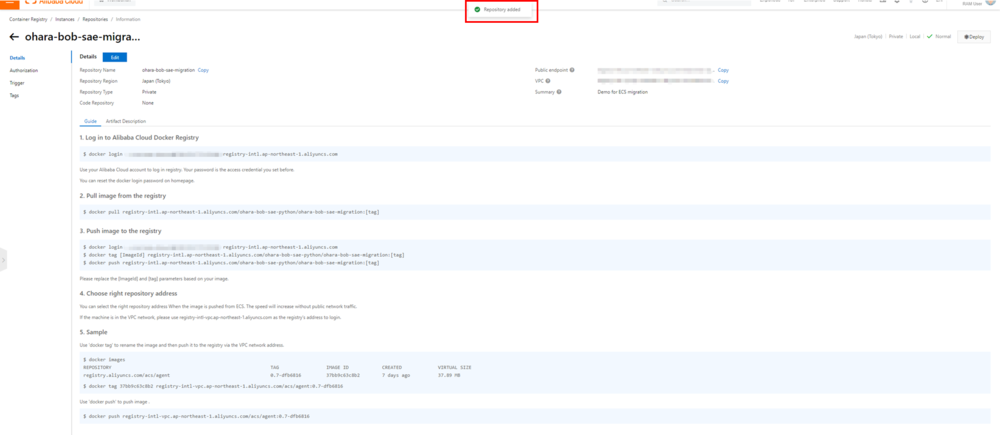 ターゲットリポジトリが正常に作成されると、詳細ページにいくつかのコマンドのサンプルが表示されます。以下のステップで、それらを直接使用することができます。