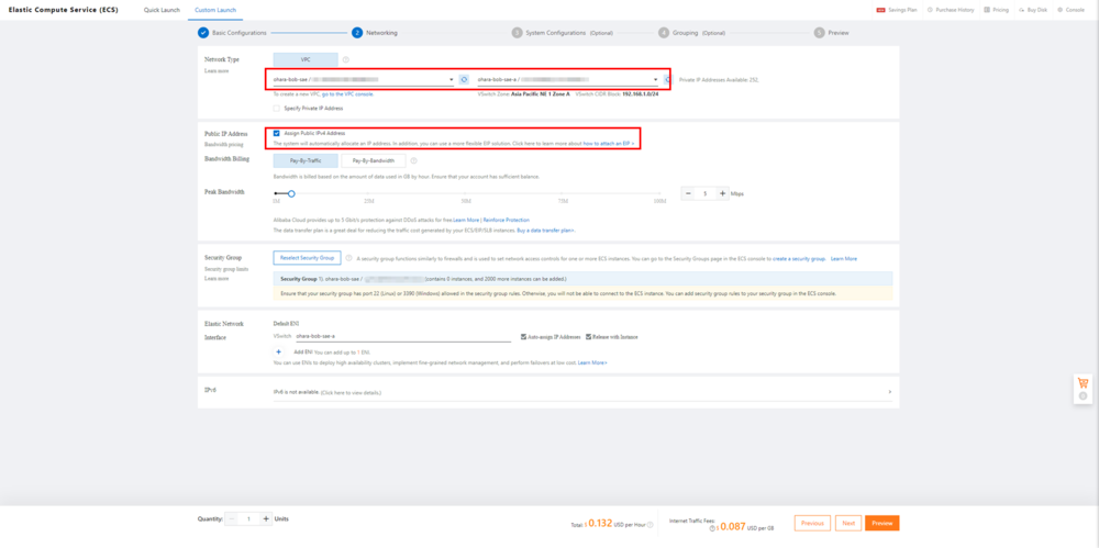 ECSインスタンスと同じVPCとvSwitchを選択します。