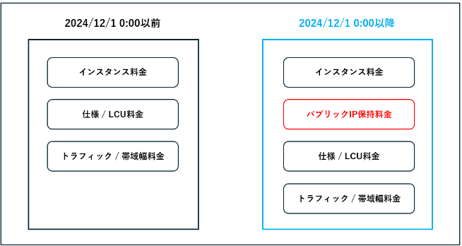 2024/12/1 0:00以降、既存および新規で作成されたCLBインスタンスでは、新たに課金項目として、パブリックIP保有料金が追加されました。公式サイトのRelease Noteでは、「インスタンス料金がパブリックIP保持料金」に変わったと記載があります。これは、インスタンス料金の課金金額がパブリックIPの保持料金の課金金額になったため、このような記載となっています。インスタンス料金については、以前と課金項目として変わりはありませんが、新しい料金に変わります。今回のアップデートポイントを簡潔に言うと、パブリックIP保持料金分の値上げとインスタンス料金の課金金額変更となります。