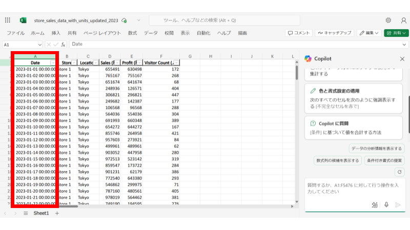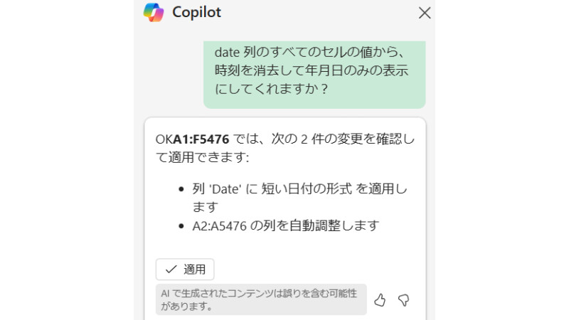 いろいろ試してみたところ、セルの値も Copilot にテキストベースでお願いをすることで編集できることも確認できました。先ほどの Copilot へのテキストを入力をすることを説明している画像で Date の列が年月日だけではなく、時間 (0:00:00) も移ってしまっていたかと思いますが、これも Copilot へ指示するだけでセルの値を編集してくれました。