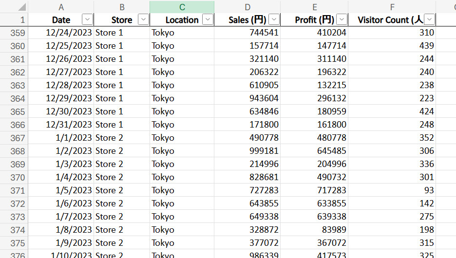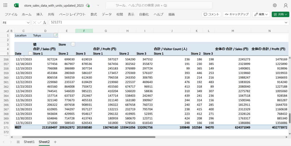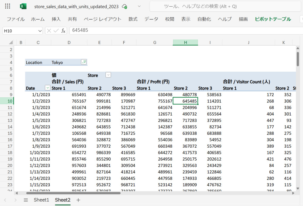 Tokyo の店舗である Store1,Store2,Store3 のデータを新しいシートにしっかりと抜き出してくれていて見やすく加工してくれています。