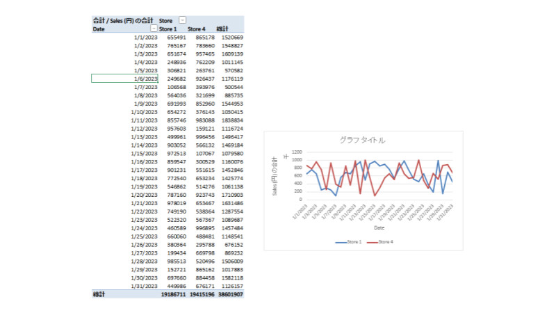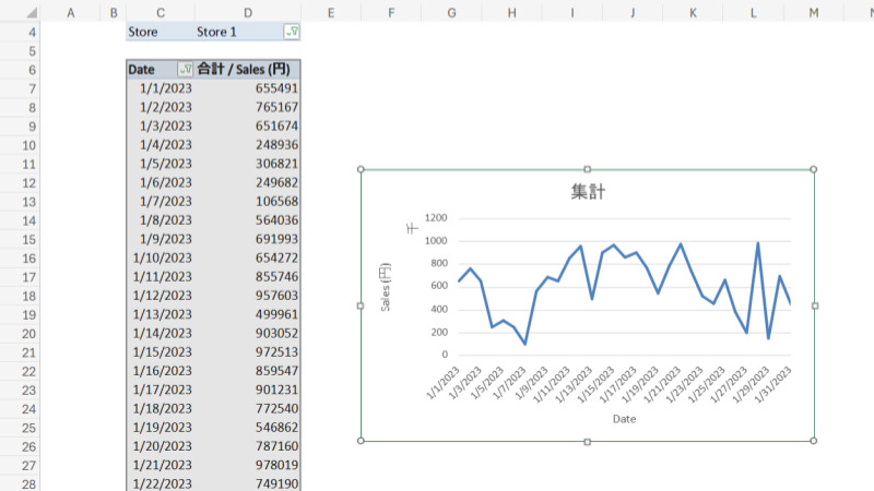 さらに Store1 と Store4 の 1月の sales の変動が分かりやすいように折れ線グラフも作成してくれました。正直 Copilot がここまでの精度のグラフを作成してくれることは予想外でした。