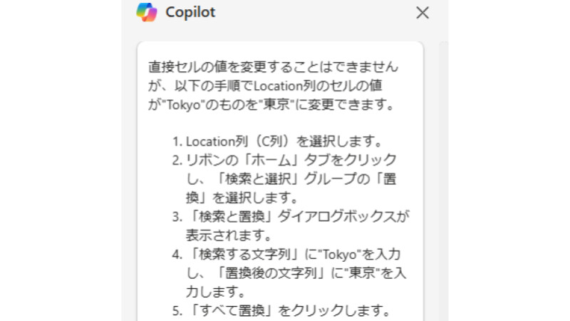 ただ、セルの値を変更してくれない場合もありました。私が以下のお願いをしたところ Copilot は「直接変更はできないがやり方は教えることができる」と返答が来ました。