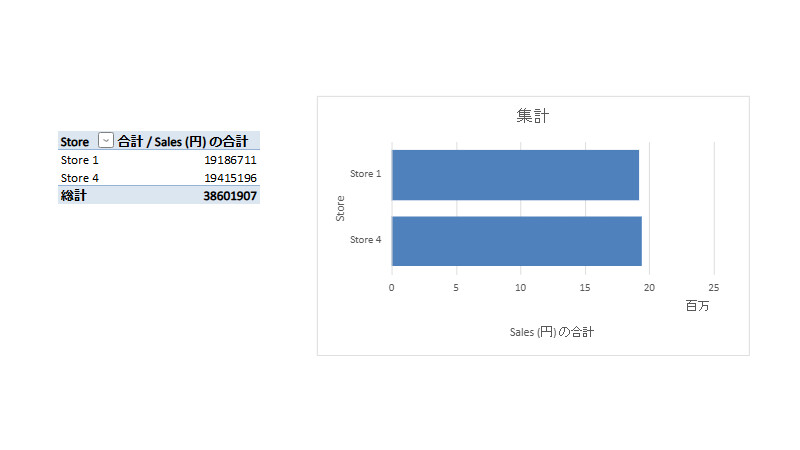 Store1 と Store4 の 1月の sales の合計金額を計算して棒グラフにしてくれました。