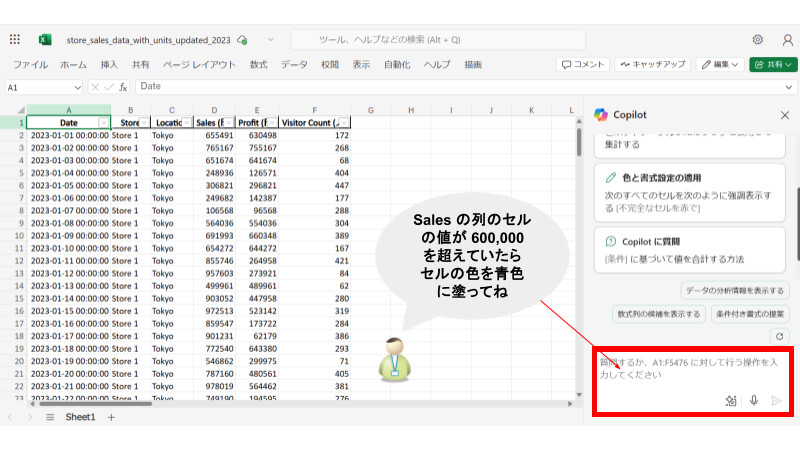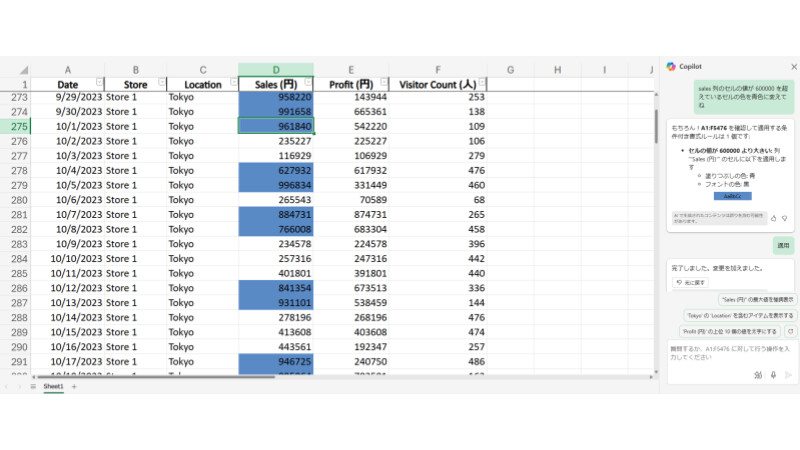 例えば、店舗の所在地が Tokyo の店舗だけのデータを抜き出して、新しいシートにコピーしたい場合があります。それを Copilot にテキストベースでお願いするとどうなるかやってみました。そうすると以下のようになりました。