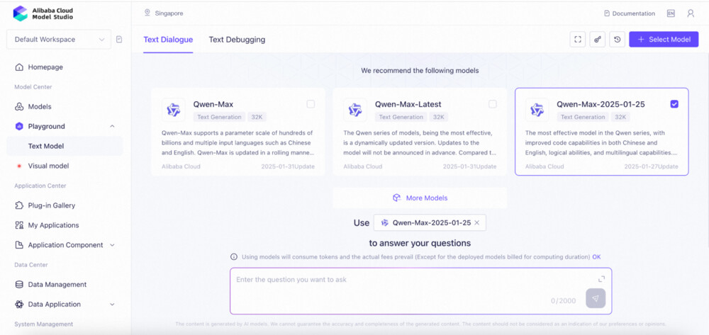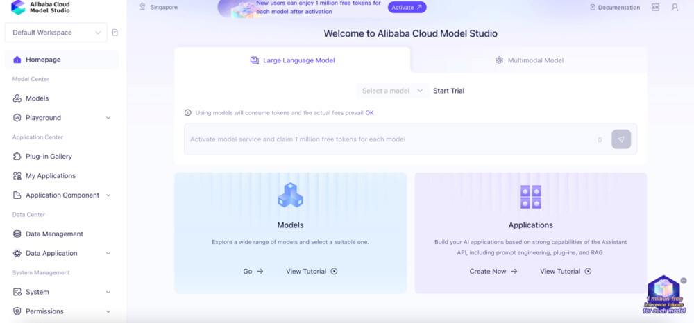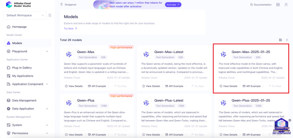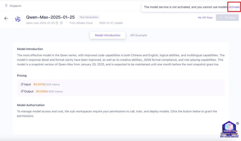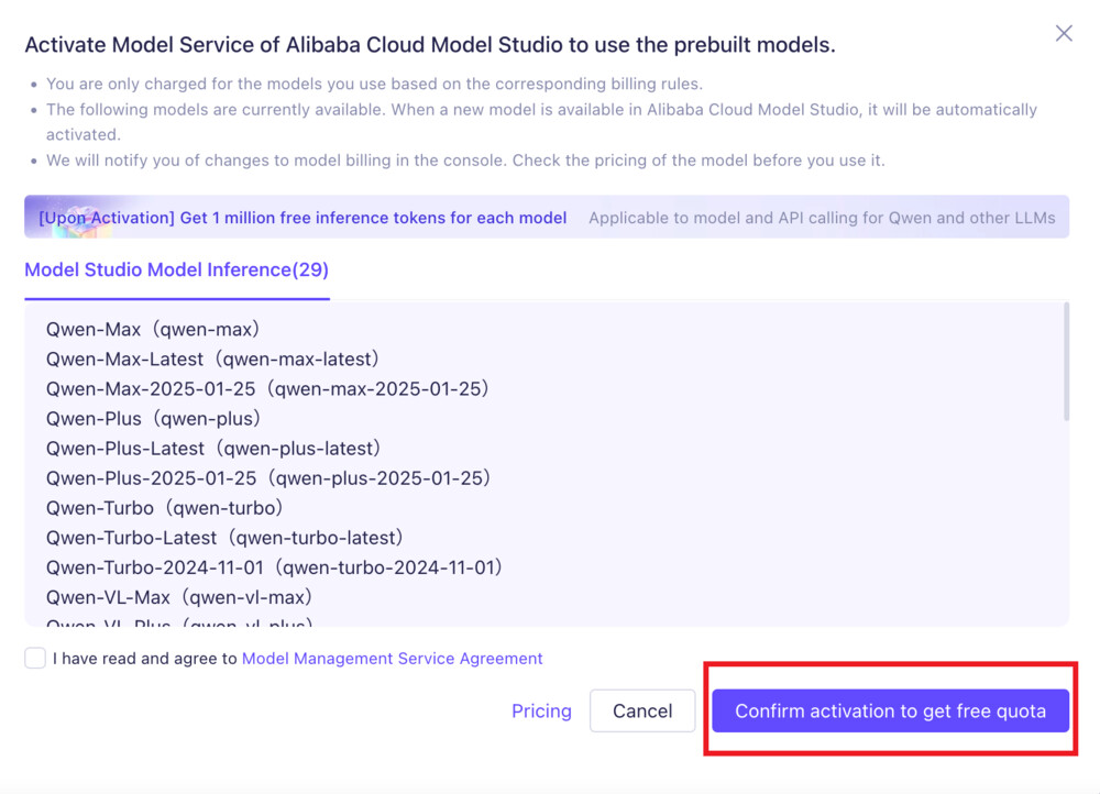 Qwen2.5-Maxを利用するために、まずはModel Studioという機能を有効化する必要があります。