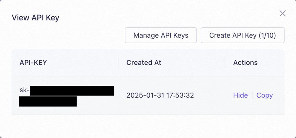 API Keyは”sk-”から始まるものとなります。後ほど利用するのでコピーするなどしてください。