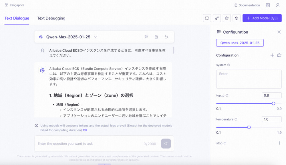 今回は、Alibaba Cloudが提供する最新の大規模言語モデル「Qwen2.5-Max」について、その概要とAlibaba Cloudからの利用方法を紹介しました。ブラウザ上のModel Studioで利用する方法と、APIで利用する方法の2つの方法を紹介しました。