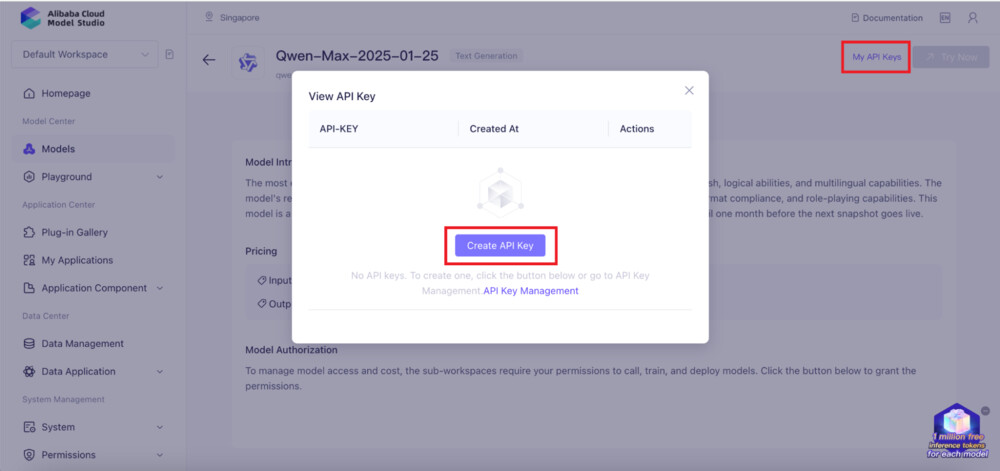 Qwen2.5-MaxをAPIを利用するためには、まずAPI Keyの取得が必要です。