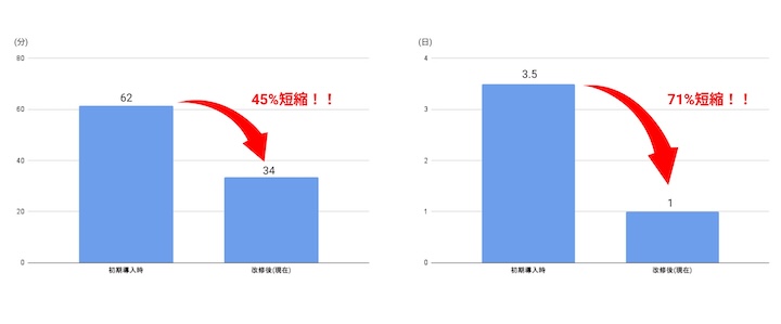 初期システム導入時に約1時間かかっていた作業が、改修後のシステムでは約30分程度に短縮され、45%の時間削減を実現した
