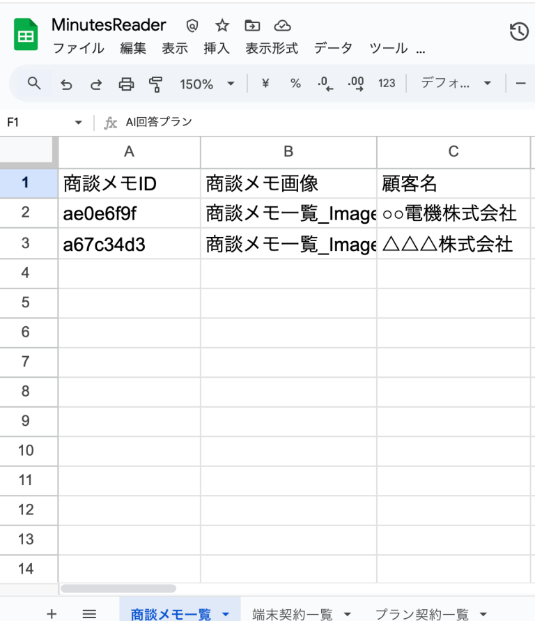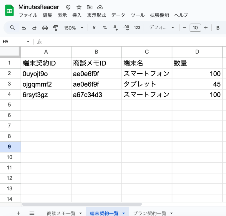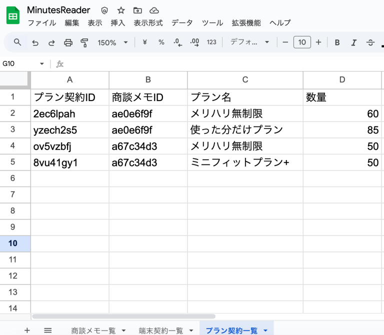 ここで、Googleスプレッドシートを確認すると、「商談メモそのものに関するテーブル」「端末の契約に関するテーブル」「プランの契約に関するテーブル」に分けてそれぞれデータが保管されています(ただし、各テーブルは「商談メモID」で結びつき関係性を保持しています)。
